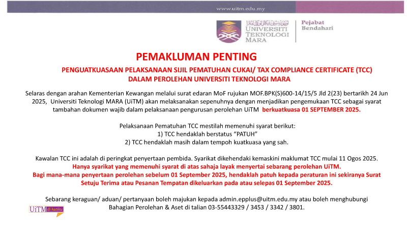 Sehubungan itu, semua syarikat, pembekal dan orang awam adalah dinasihatkan agar sentiasa berwaspada dan tidak mudah terpedaya dengan sebarang bentuk tawaran meragukan yang kononnya dibuat atas nama mana-mana staf UiTM Cawangan Kedah.