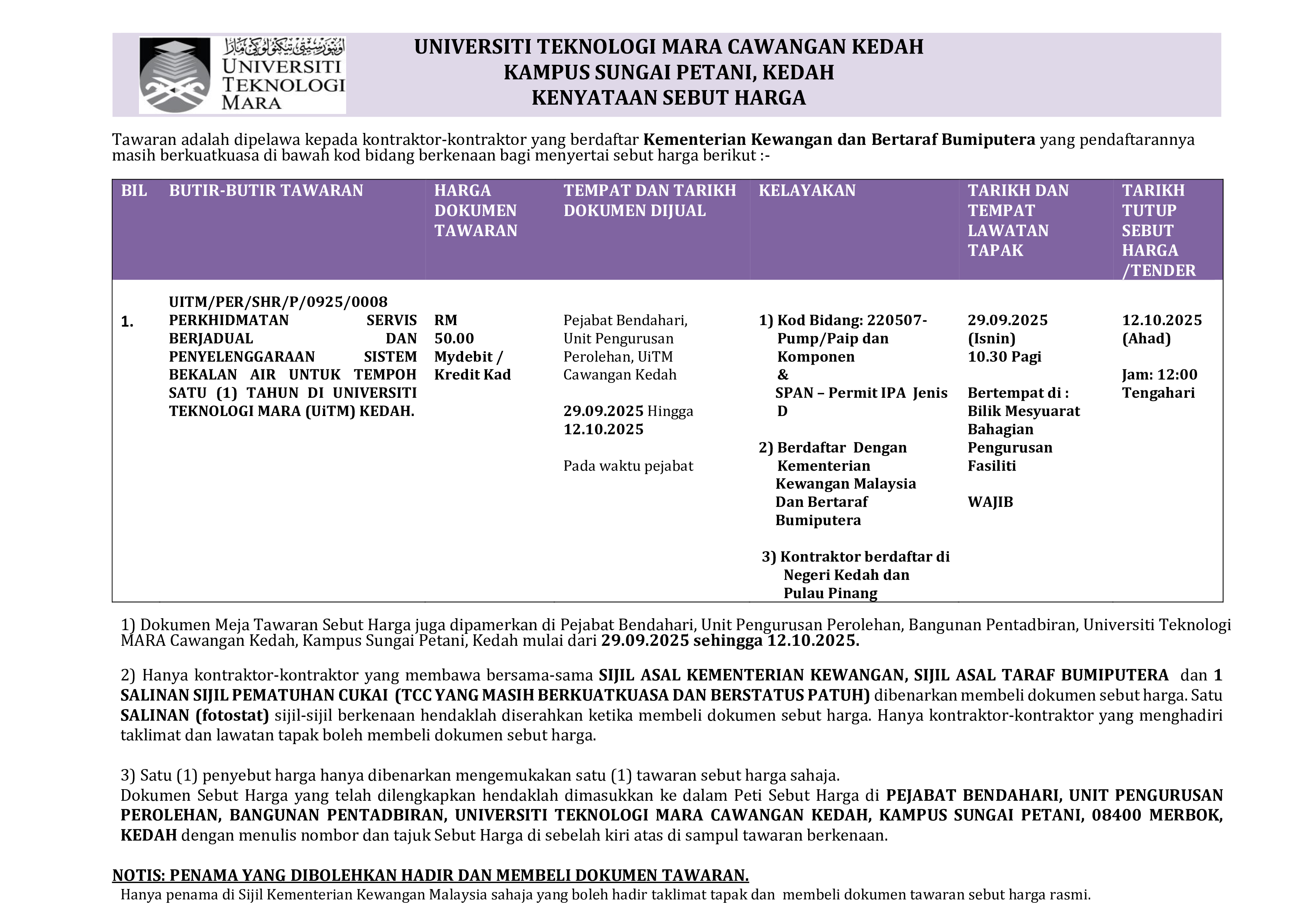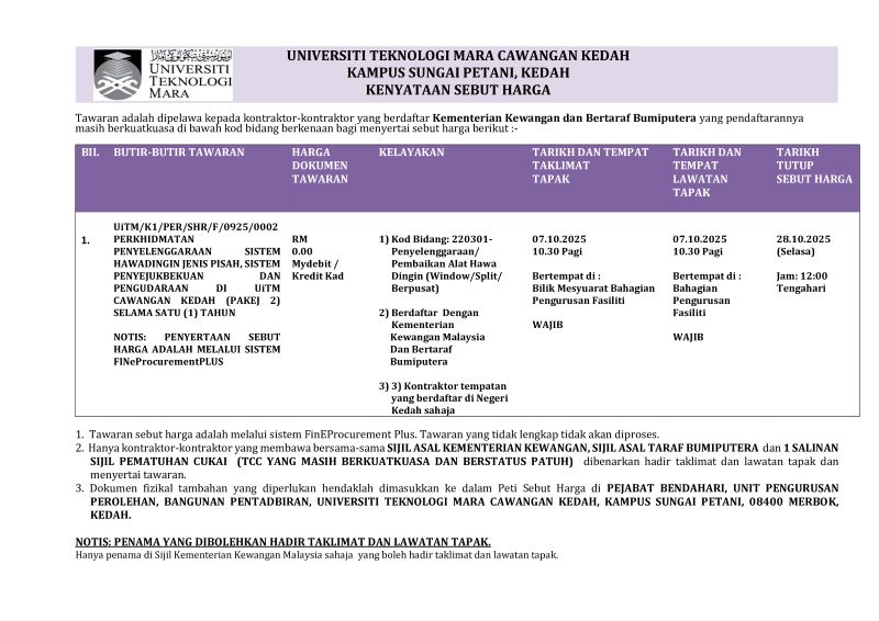Sehubungan itu, semua syarikat, pembekal dan orang awam adalah dinasihatkan agar sentiasa berwaspada dan tidak mudah terpedaya dengan sebarang bentuk tawaran meragukan yang kononnya dibuat atas nama mana-mana staf UiTM Cawangan Kedah.
